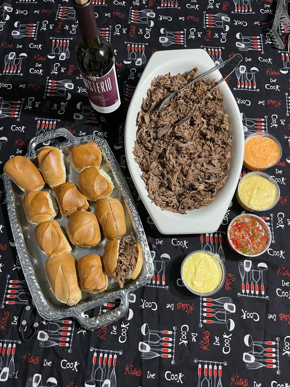 > Pata flambeada con sus panes de acuerdo a los comensales, salsas variadas (mayonesa con ajo, morrones, berenjena, entre otras)